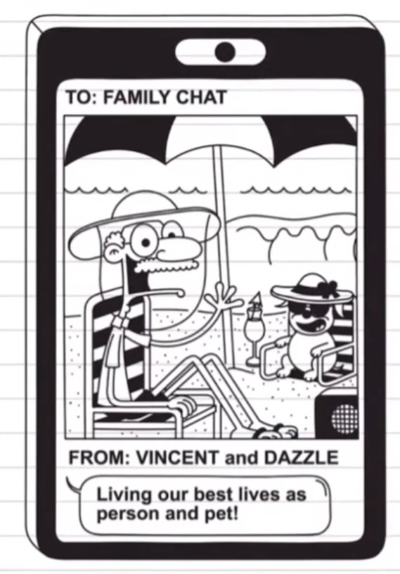 The next morning, Susan takes a break telling the family that they have a day off and Greg decides to explore the island taking Susan's phone with him and he visits multiple places with air conditioning to escape Frank singing on the boardwalk for the punishment of yesterday's game-night. While attending an author's book talk, Greg receives a notification from Susan's phone, on the family group chat, opening him up to the corny messages his family has sent.