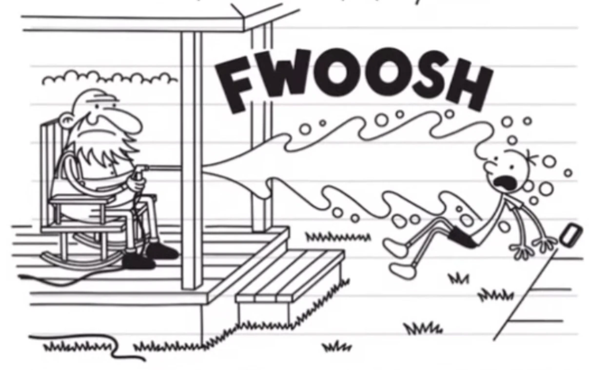 Greg gets watered by an old man with a hose.