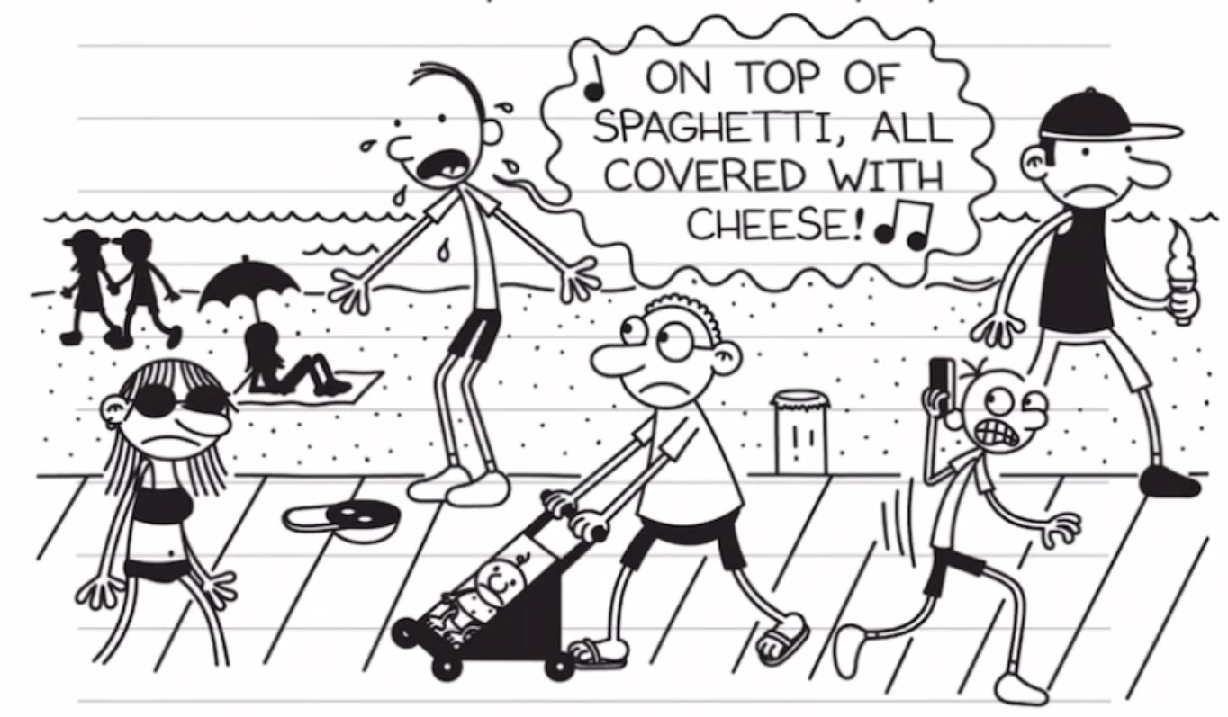 - This is the first book since Wrecking Ball to have Greg in a pile of something in the cover, with Wrecking Ball having Greg in a pile of debris, this book has him in a pile of spaghetti.