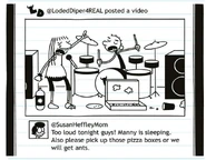 On the day of the Talent Show, Frank is required to ride the band's van with Bill, something he wasn't thrilled about because of the band's name. Löded Diper gets paired with Harry Gilbertson, much to Rodrick's dismay. Afterwards, Bill starts their opening, asking the audience if they were ready to rock. Rodrick, Drew, and Bill blast metal music with Ward providing security and Susan recording their performance. Frank, meanwhile, gets away from the stage with cotton wads plugged in his ears. [5]